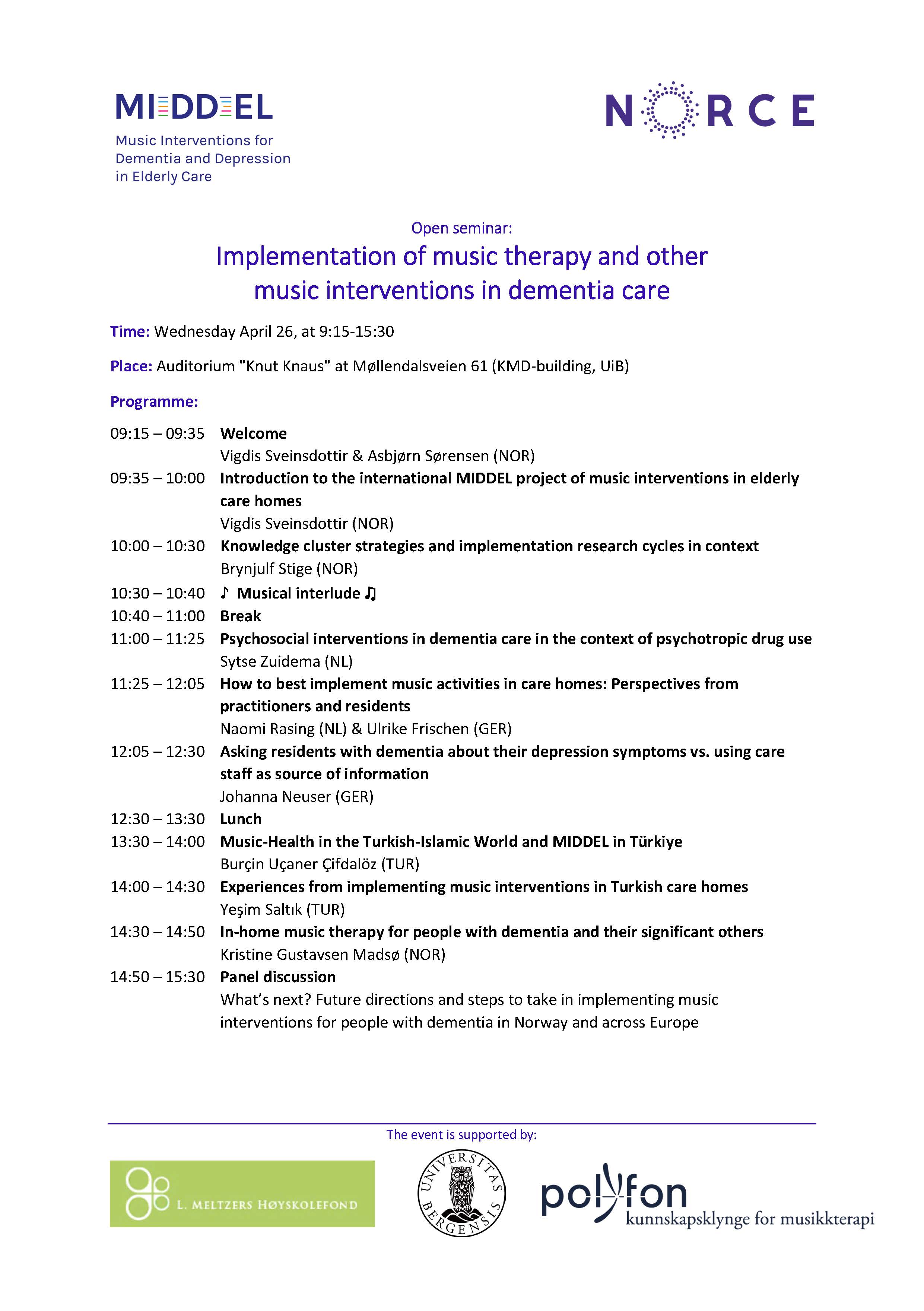 MIDDEL OPEN SEMINAR: Implementation of music therapy and other music interventions in dementia care