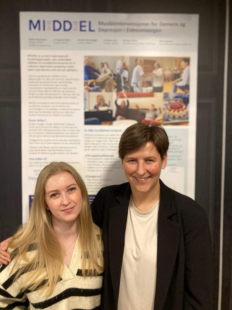 Poster presentation "MIDDEL - MusikkIntervensjoner for Demens og Depresjon i Eldreomsorgen" by Vigdis Sveinsdottir, Jo Dugstad Wake, Monika Geretsegger, Christian Gold, Kathrine Dahle, & Stine Sognnes